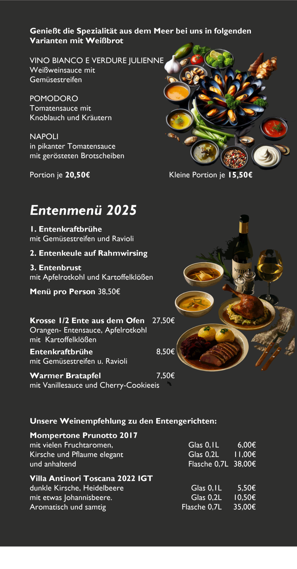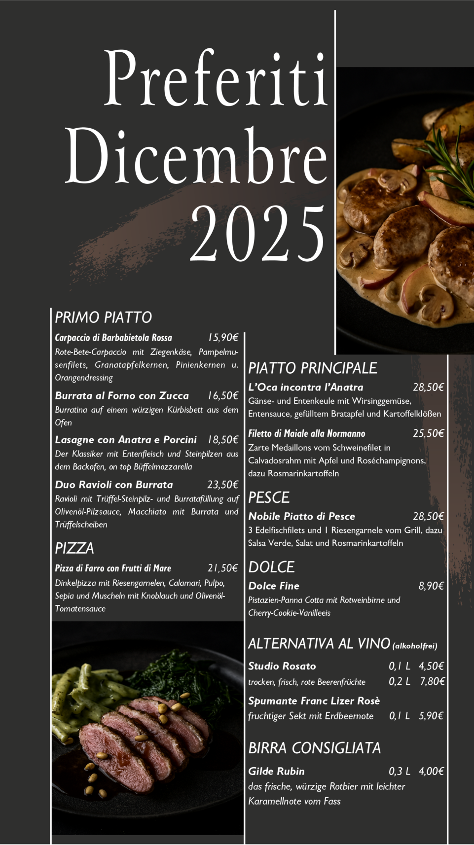 Liebe Gäste, willkommeninderKückenmühle–Ihrem gemütlichenRückzugsortfürgenussvolle MomenteundkulinarischeEntdeckungen! InunseremcharmantenRestaurant erwartetSieeinewechselnde*Preferiti*Karte,dieetwamonatlichmitsaisonalen Highlightsundliebevollzusammenge-stelltenGerichtenbegeistert.Dazuservie-renwirIhneneineerleseneAuswahlan Weinen,dieperfektaufdieAromenunserer Speisenabgestimmtsind.Nebenden saisonalenKreationenbietenwirIhnen aucheineVielfaltanfrischenBowls,die gesundundgeschmackvollsind,sowie unsereköstlichen*Borsa*–italienische Taschen,liebevollgefülltmitGemüseund Fleisch.LassenSiesichverwöhnenund genießenSieunvergesslicheStundeninder Kückenmühle!Egal wie, wir freuen uns auf Sie!Olaf RösselP.S: unser Weihnachtsmenü finden Sie hier